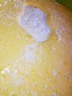 Jak już mamy zmiksowaną masę jajeczną, wsypać mąkę, cukier waniliowy, wlać olej i proszek do pieczenia. I również całość zmiksować do połączenia się masy jajecznej z dodanymi składnikami