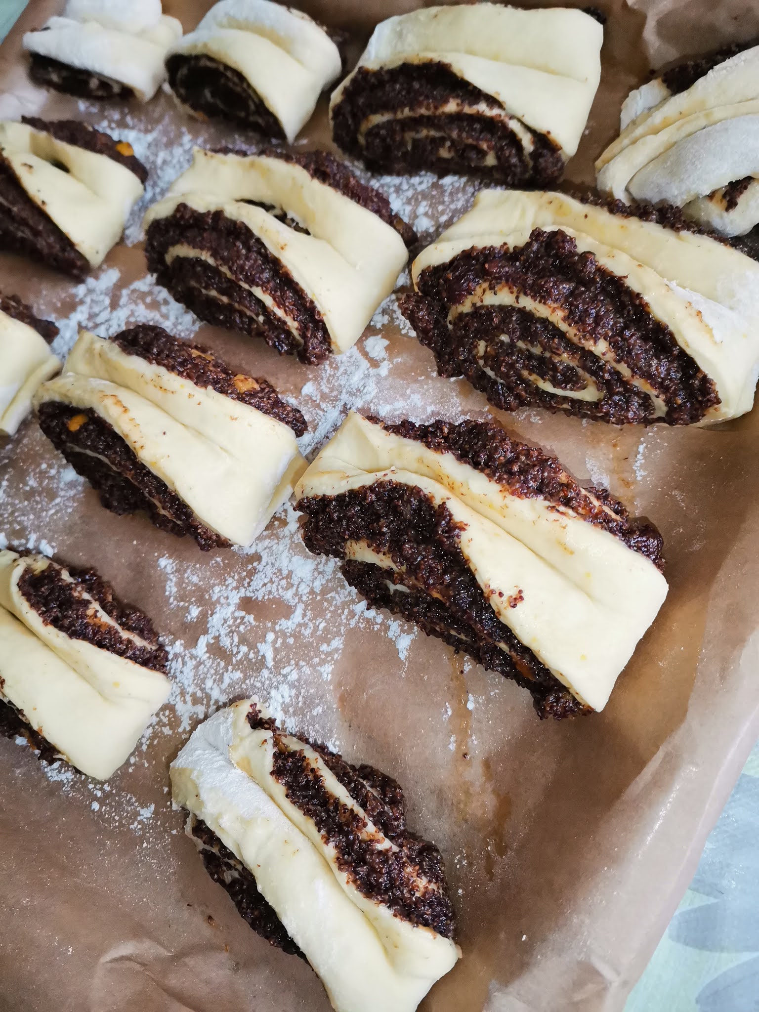 Przygotowane ciasto drożdżowe z wyłożoną masą makową zwinąć w rulon od węższej strony. Gdy już mamy zwinięty wtedy pokroić na paski po 4 centymetry i każdy kawałek paska przez środek nacisnąć tępą stroną noża aby uformować drożdżówkę. Uformowane bułeczki drożdżowe ułożyć na blaszce od piekarnika wyłożonej papierem do pieczenia